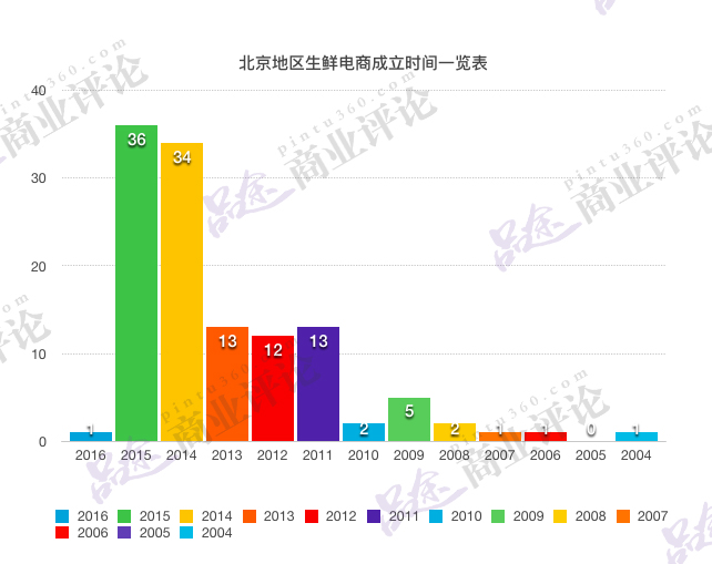 品途通过对所盘点数据的整理发现,2014年、2015年无疑是生鲜创业的爆发期,然而爆发期过后,生鲜创业热情急转直下,2016年只有1家新创立企业,整个生鲜行业从爆发进入淘汰。如上图所示,2004年至2010年期间,生鲜电商处于萌芽状态,每年创立的生鲜电商数量在0~5家之间。2011~2013年期间;生鲜电商创立数目增幅较大,数量在12~13家之间;2014~2015年期间,生鲜电商的创立数量继续大幅增加,达到34~36家之多,但到了2016年,数量骤降,截止目前,仅成立1家。