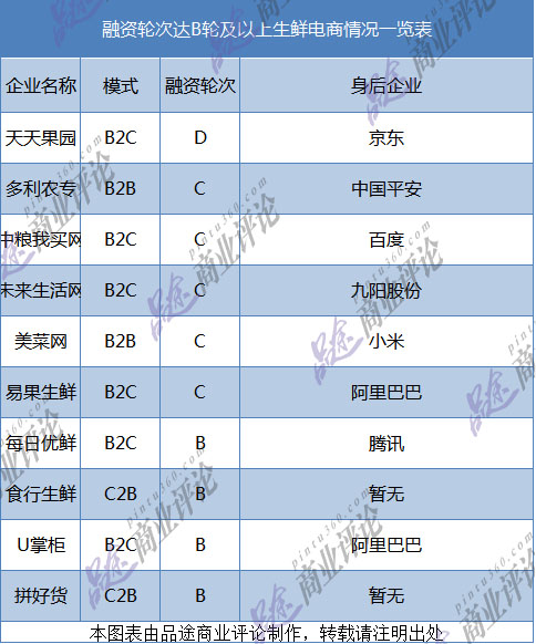 其中,有六家B2C模式的生鲜项目分别傍了京东、阿里巴巴、百度、腾讯等巨头。巨头入局生鲜行业,与普通入局者相比,在资金、渠道等资源方面存在巨大优势,所以巨头扶持的几个企业发展都不错,至少从目前来看,有“干爹”的生鲜电商融资轮次比没有“干爹”的生鲜电商融资轮次更靠后。但巨头毕竟数量和资源有限,一对多,抛开B2C模式同质化严重的忧虑,创业者也难以获得巨头全心全意的扶持。正如美味七七被亚马逊翻了牌,但据业内人士分析,亚马逊把精力都放在海外直购上了,战略重点不看生鲜,所以不愿意更多投入。