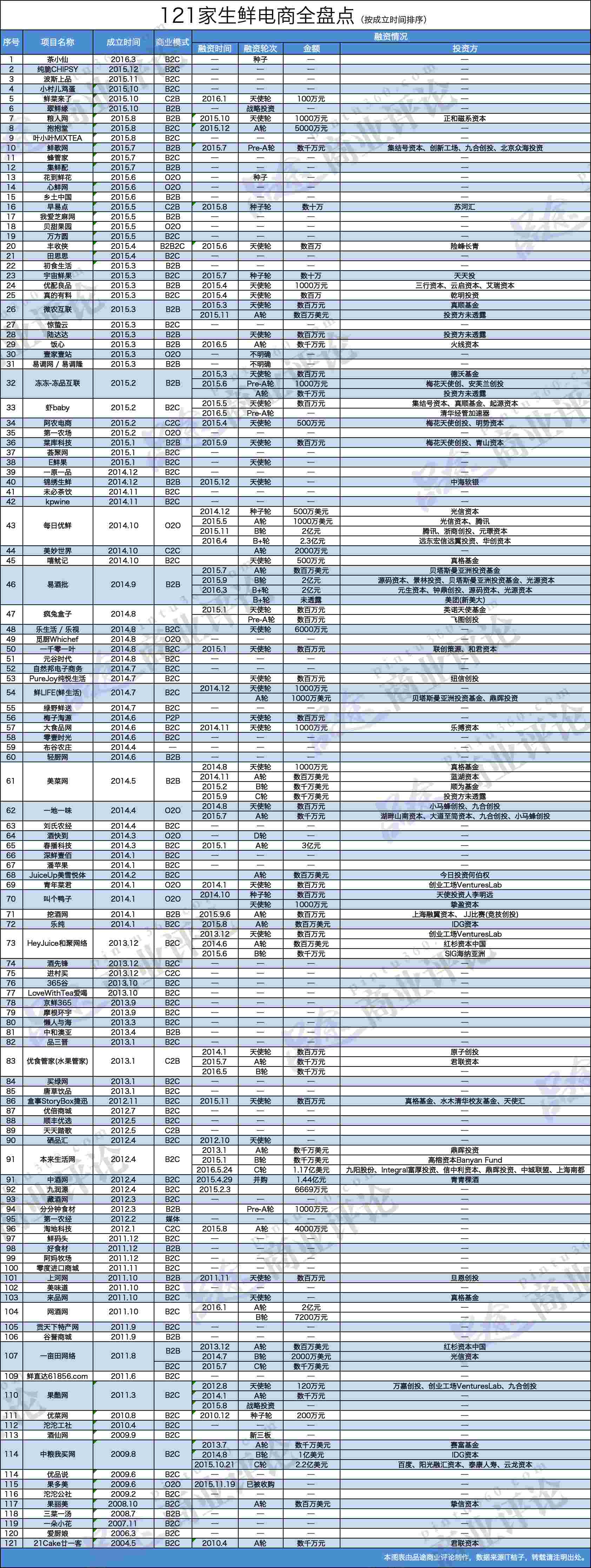 品途商业评论通过对121家生鲜电商数据盘点得出以下结论:生鲜电商行业淘汰赛将来;B2C竞争最为激烈;融资要求数据漂亮;资本追着生鲜跑的剧情反转了,今年生鲜得追着资本跑。