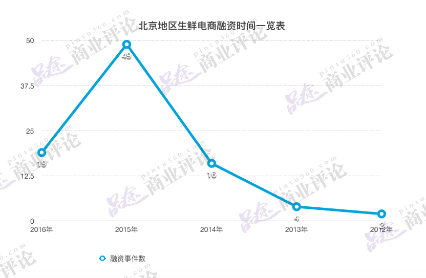 最后,我们再来审视近4年来的生鲜融资事件数量。不难发现,在2012~2015年间,生鲜电商融资事件不断增多,在2015年达到顶峰。2016年看起来也不少,在半年的时间内也产生19起融资事件。但需要注意的是,企业融资成功一般不是立马宣布,往往因为资金到账、企业战略等因素推后3~6个月公布,所以今年以来发生的融资时间到底有几家是真的在今年融资成功还值得商榷。资本入局对于“缺钱”的生鲜电商而言,不论是缓解资金紧缺还是应对外界质疑,还是都有利的。