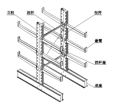悬臂式货架一般由底座、立柱、悬臂、连杆、拉杆座、拉杆组成。悬臂可以是单面或双面,悬臂式货架具有结构稳定,载重能力好、空间利用率高等特点。根据承载能力可分为轻量型、中量型、重量型三种。