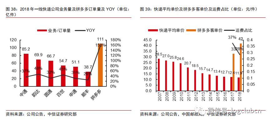 拼多多订单量占到“三通一达”的 20%以上,是与各快递公司合作的重要筹码;定增加大电子面单等研发投入,依托规模谋求话语权。2018 年拼多多平台订单量 111 亿件,远超一线快递公司业务量,约等于圆通+申通的总业务量。从订单增速上看,2018 年拼多多同比增速 158%,远超一线快递公司增速。随着快递市场的饱和,竞争加剧,快递行业平均单价不断下降,2018 年降至 11.9 元/件,但与拼多多客单价的比达到 28%。