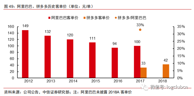 (2)客单价:拼多多客单价逐年上升,阿里客单价逐年下降。2018 年拼多多客单价 42 元/单,阿里客单价 97 元/单。一方面,阿里顺应消费升级,高端品牌类商品热销(如国际品牌化妆品等)拉升客单价;另一方面,下沉低线、拼购等拉低客单价;预期未来 2 年左右阿里客单价将维持在 100 元左右。