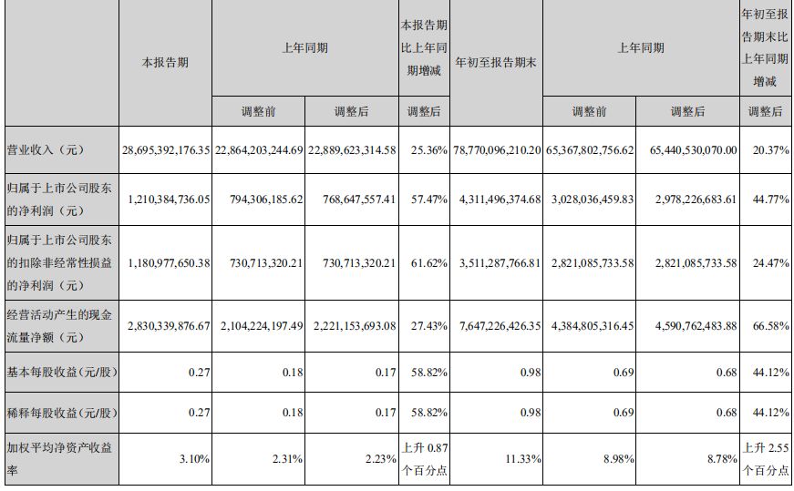 10月25日晚间,顺丰公布了2019年三季报,前三季度实现营业收入787.70亿元,同比增长20.37%;实现归属于上市公司股东的净利润43.11亿元,同比增长44.77%;经营活动现金流净额为76.47亿元,同比增66.58%;基本每股收益为0.98元,同比增长44.12%。