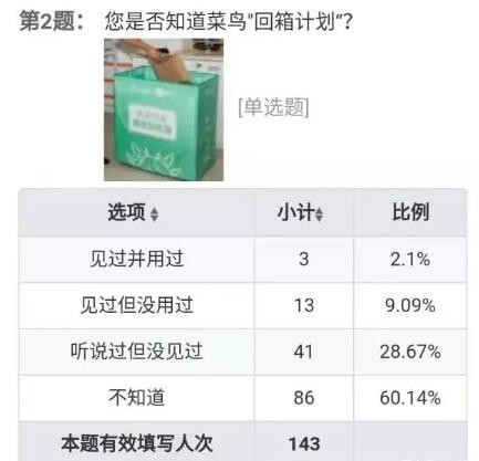 一份调查问卷显示,143位受访者只有16位见过菜鸟绿色回收箱,3位使用过回收箱。