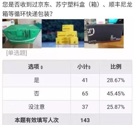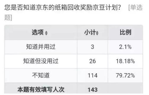 在143位问卷受访者中,只有3位知道并使用过京东的纸箱回收,近80%表示从未听说过该计划。