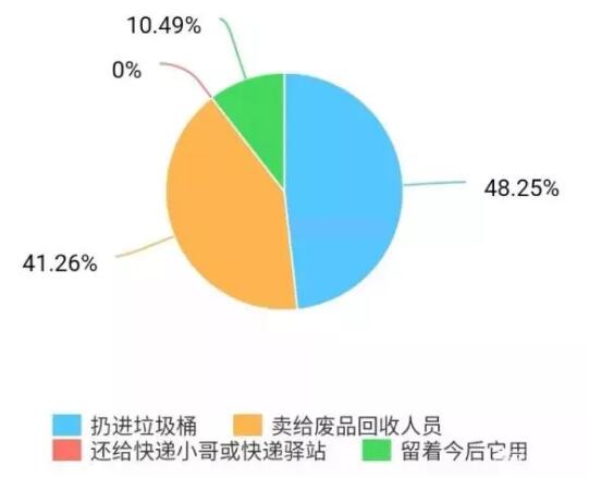 在143位问卷受访者中,近半数表示会将纸箱直接扔进垃圾桶,只有15位表示会留作它用,会归还快递小哥或快递驿站的则无一人。纸箱的直接二次利用率只有10.49%。