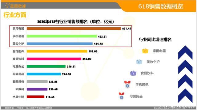 根据星图数据的研究显示,618期间销售额排名前三甲分别是家用电器、手机通讯、美妆个护。增速最快的是:家用电器、美妆个护、食品饮料、手机通讯、母婴用品。