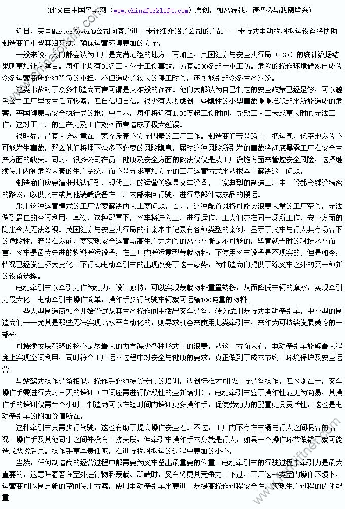 步行式电动牵引车提供更安全的操作环境