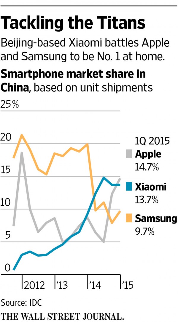 小米正以接近于成本的价格销售功能齐全的智能手机,为了登上中国智能手机市场的头把交椅,它与苹果和三星电子展开了激烈交锋。在咄咄逼人的小米面前,三星电子去年在中国智能手机市场的份额严重缩水,这也成为这家韩国电子巨头2014年利润大幅降低并重新思考市场战略的原因之一。