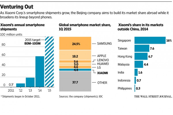为了将小米打造成为一个具有全球知名度的品牌,雷军希望以公司在中国的巨大成功为依托,迅速开拓海外市场。小米在2011年中才开始涉足智能手机市场,而根据市场研究机构IDC的数据,到2015年第一季度,小米在中国智能手机市场的份额已经达到13.7%,仅次于苹果的14.7%。小米表示,该公司智能手机销量去年增长了一倍以上,达到6100万部,预计今年销量最高将达到1亿部。