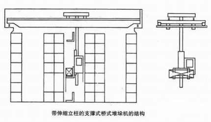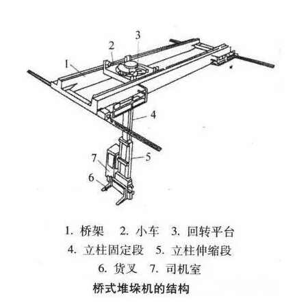 桥式堆垛机具有起重机和叉车的双重结构特点,像起重机一样,具有桥架和回转小车。桥架在仓库上方运行,回转小车在桥架上运行。同时,桥式堆垛机具有叉车的结构特点,即具有固定式或可伸缩式的立柱,立柱上装有货叉或者其他取物装置。