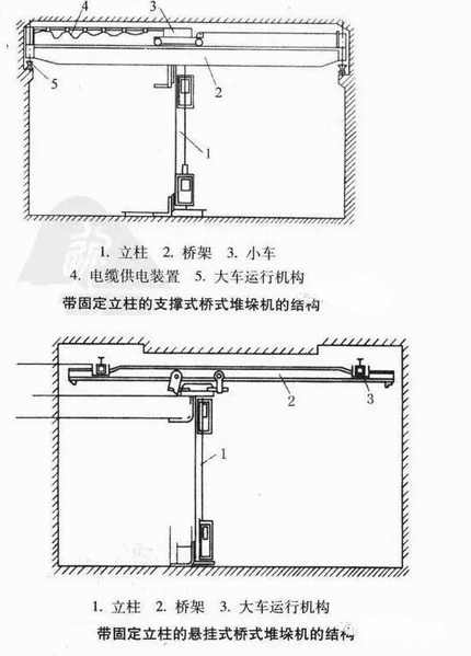 货架和仓库顶棚之间需要有一定的空间,保证桥架的正常运行。立柱可以回转,保证工作的灵活性。回转小车根据需要可以来回运行,因此桥式堆垛机可以服务于多条巷道。桥式堆垛机的堆垛和取货是通过取物装置在立柱上运行实现的,因为立柱高度的限制,桥式堆垛机的作业高度不能太高。